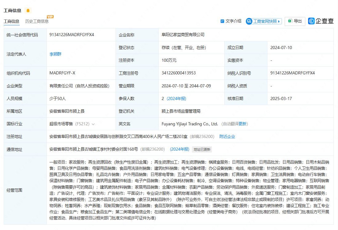 阜阳亿家益商贸有限公司成立于2024-07-10,法定代表人为李颍群,电话:18696649153,注册资本为100 万人民币,统一社会信用代码为91341226MADRFGYFX4,企业注册地址位于安徽省阜阳市颍上县古城镇江李村村委会对面168号,经营范围包括:一般项目:日用百货销售;日用品批发;日用品销售;日用木制品销售;日用化学产品销售;办公设备销售;针纺织品销售;厨日用家电零售;五金产品零售;通信设备销售;灯具销售;家具销售;卫生洁具销售;电动自行车销售;保温材料销售;门窗销售;建筑用金属配件制造;电子产品销售;办公设备耗材销售;家用电器销售;家居用品销售;金属材料销售;农副产品销售;